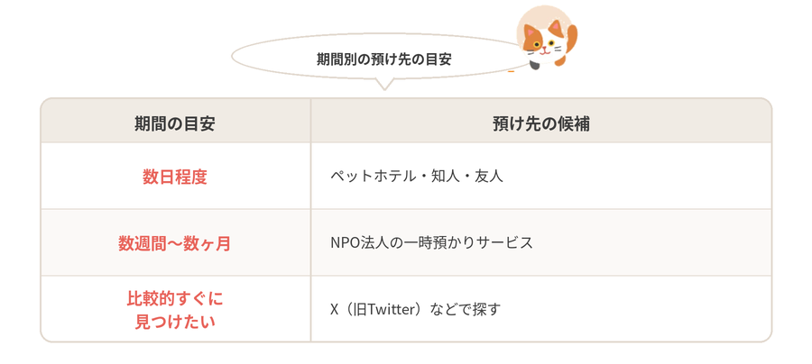短期であればペットホテル、数週間から数ヶ月であればNPO法人の一時預かりサービスが利用できるかもしれません。